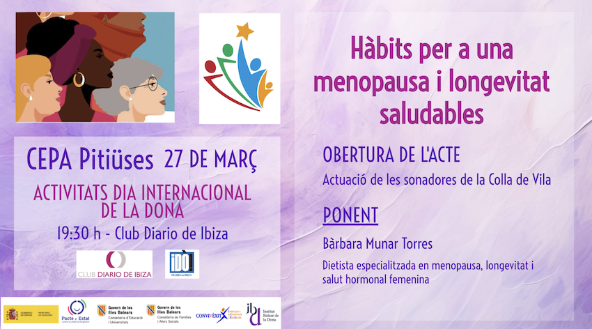 Seguim amb les activitats. El divendres 27 de març al Club Diario de Ibiza teniu una cita amb el CEPA Pitiüses i na Bàrbara Munar que ens parlarà sobre com portar una dieta saludable durant la menopausa. L’activitat està oberta per a tothom.