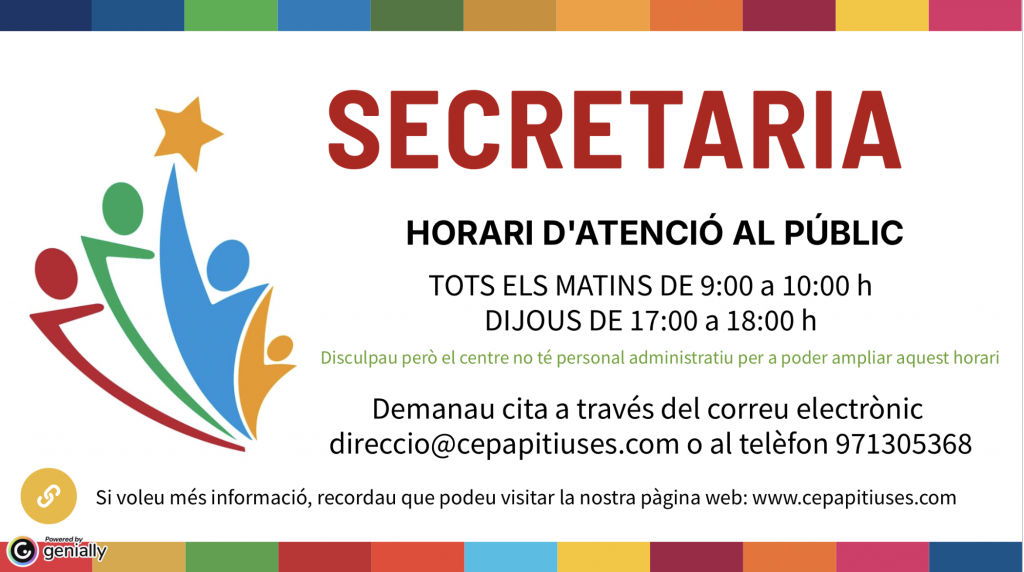 En el CEPA Pitiüses NO TENIM personal administratiu, per tant només us podem oferir horari d’atenció al públic quan el professorat no té classes. Per tant no ens és possible oferir-vos un horari d’atenció que sigui extens.